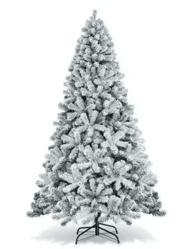 Kunstigt juletræ med naturtro grene med sne. Træet måler cirka 240 cm i højden og 130 cm i diameter og kommer med fod.